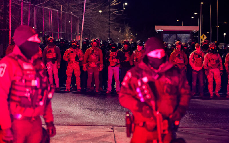 Federal officers line up outside as demonstrators protest outside of the Whipple Federal Building on January 17th, 2026, in Minneapolis, Minnesota. Protests have ramped up around the Minneapolis / St. Paul metro area following the fatal shooting of Renee Good by an immigration enforcement agent during an incident in south Minneapolis on January 7th. | Photo by Steven Garcia / The Verge