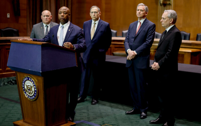 Rep. Glenn Thompson (R-PA), from left, Sen. Tim Scott (R-SC) Sen. John Boozman (R-AK), Rep. French Hill (R-AK), and David Sacks, White House Artificial Intelligence (AI) and Crypto czar, during a news conference on Capitol Hill in Washington, DC, US, on Tuesday, Feb. 4, 2025. | Ting Shen/Bloomberg via Getty Images.